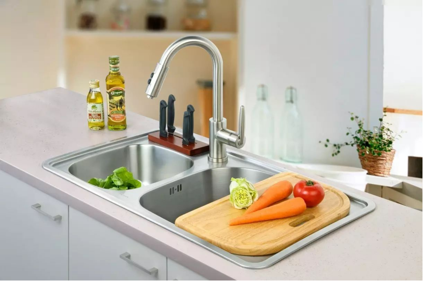 相对比前两种,台下盆清理起来,就相当于福利了。它是需要把水槽安装在橱柜台面下面,整体融为一体后,台面上的水、饭渣、菜叶轻轻一抹也就到水盆里了。