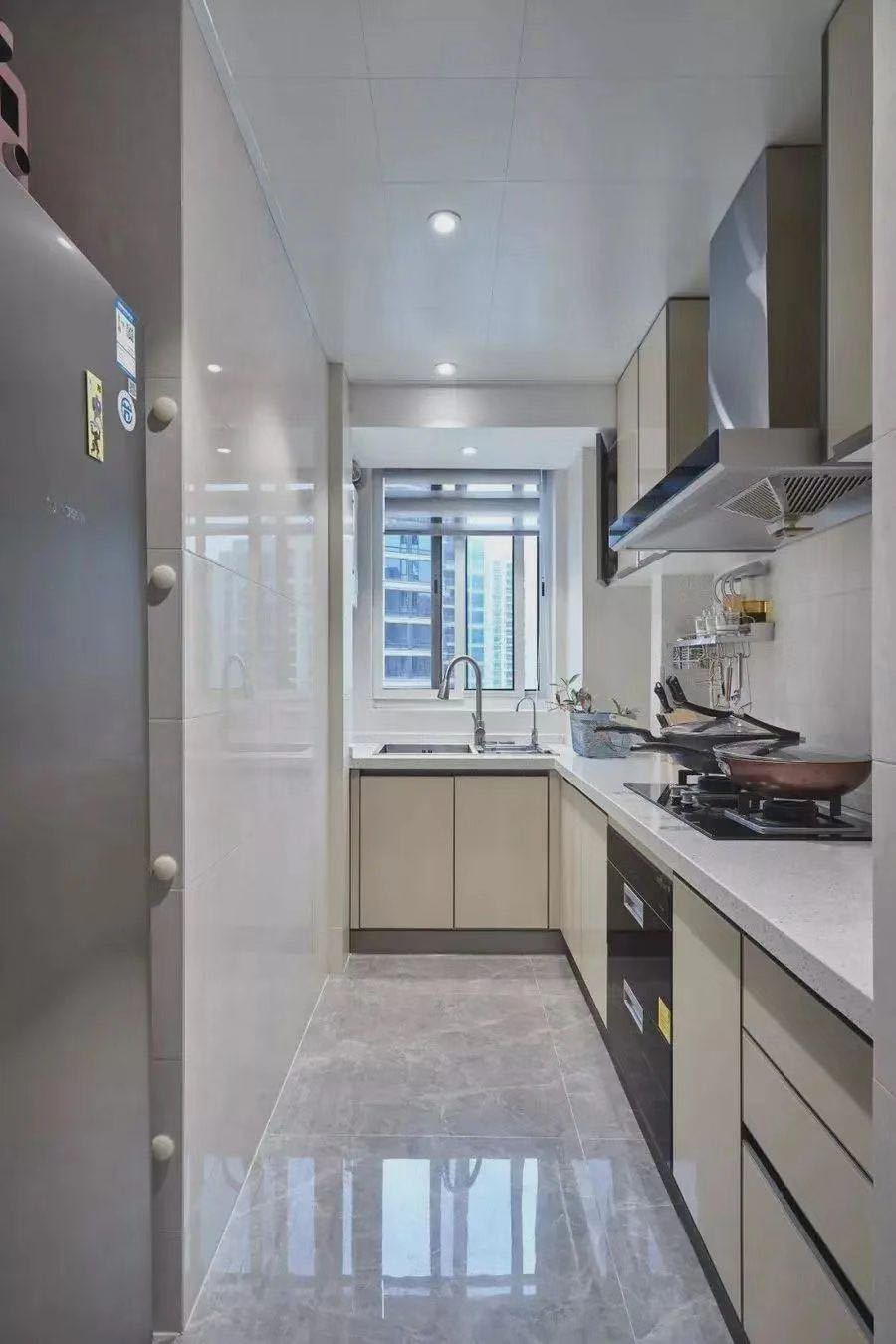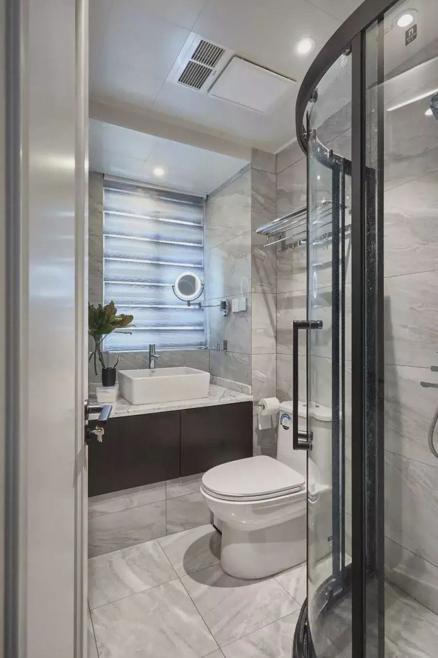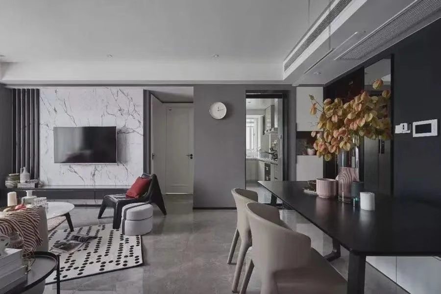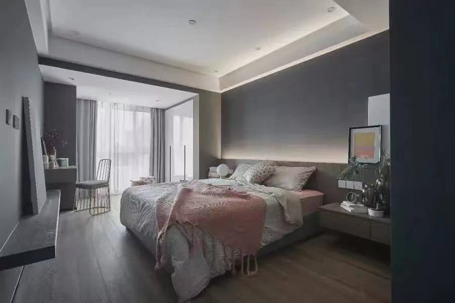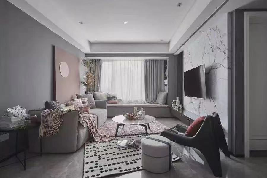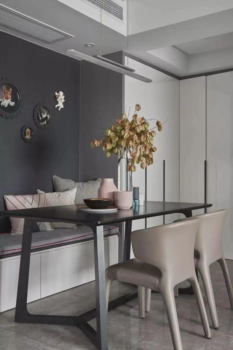 新房面积108平,采用的是现代轻奢风三居室案例,全屋采用灰色调为主,并在细节处用了暗粉色作为点缀,让整个空间在庄重之余又多出了一丝浪漫感,营造出这样一个轻奢有格调的家。入户没有玄关走廊的户型,设计师利用厨房门外的墙面和餐厅背景墙来做收纳,到顶的鞋柜有着更大的储物空间。卡座式的餐桌和柜子连在一起,L型的到顶柜子能够满足更多的收纳需求。卡座的上方还做了瓷盘装饰,搭配精致的餐桌摆设,显得更为美观。客厅位于餐厅的侧方,在灰色调为主的客厅内加入了部分的暗粉色作为调剂,通过软装的点缀来展现出优雅、浪漫感。厨房是个狭长的空间,设计师选择了布置L型的橱柜,动线更为合理。地面铺贴的灰色调的抛光砖搭配墙面的素色墙砖和橱柜,让厨房看起来更为简洁大方。主卧室同样是以灰色调作为主色,在床头靠背的后方加入了藏光,把阳台和主卧结合起来,显得更为宽敞,又能增强卧室的收纳能力。公用卫生间整体铺贴米白色的大理石质感的墙面、地面砖,把洗手台放在了靠窗的位置,整个卫生间的设计让人感觉非常的现代雅致。