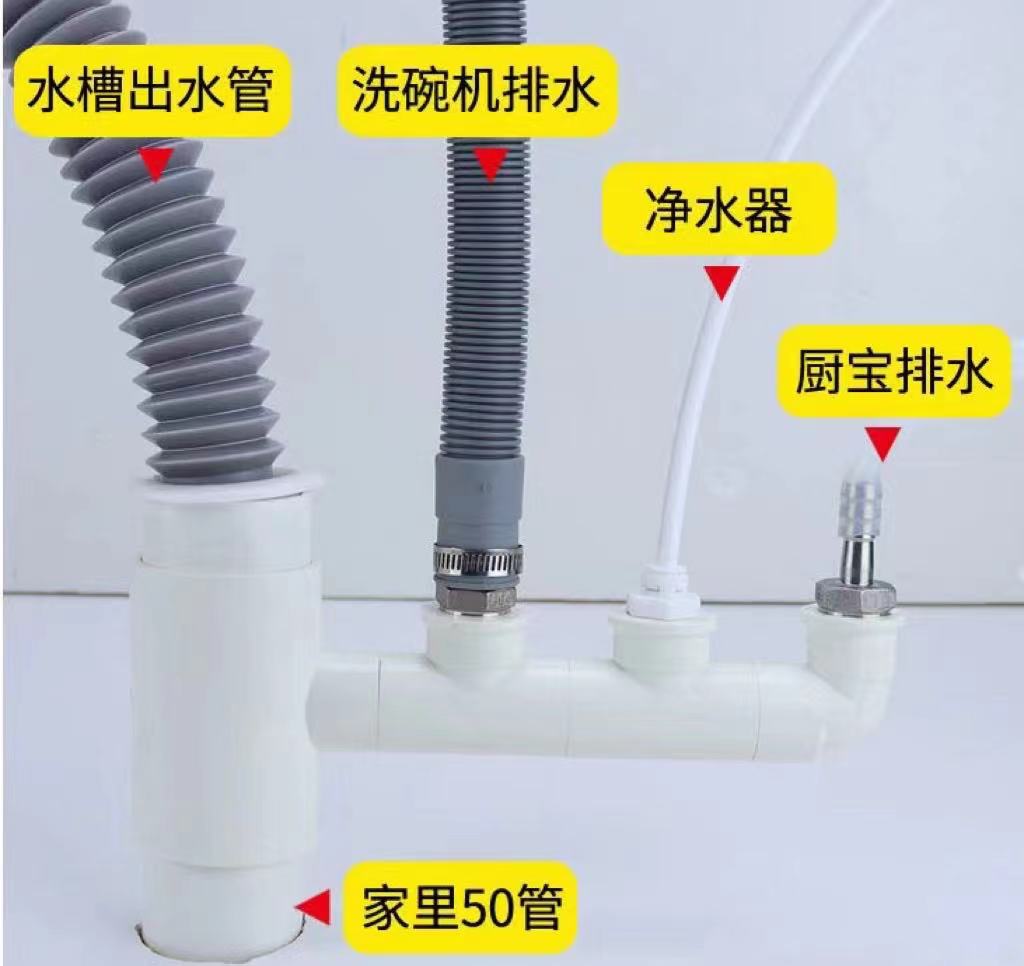 四、提前准备下水三通,直接插到厨房的下水管上,它可以连接洗菜池的下水管、净水机的下水管、前置过滤器的排水管,非常好用。